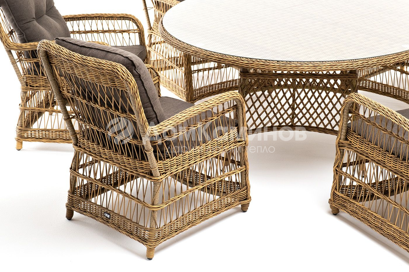 Обеденная группа на 6 персон «Эспрессо» из ротанга. В комплекте: большой круглый обеденный стол (1500×1500×750 мм.) и 6 кресел (600×800×910 мм).