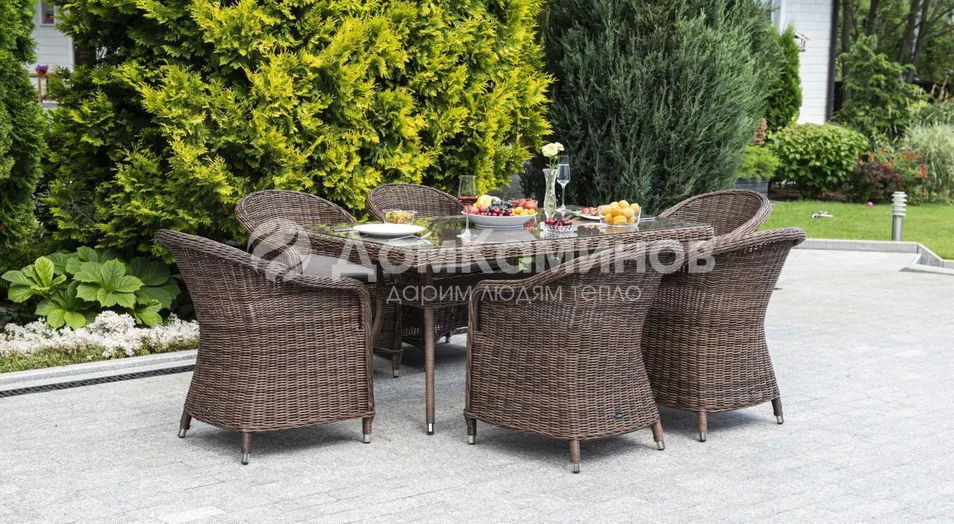 В комплект обеденной группы входит один обеденный стол, шесть стульев и подушки.