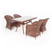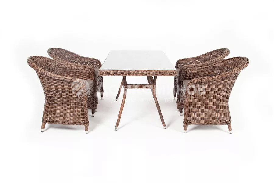 В комплект обеденной группы входит один обеденный стол, четыре стула и подушки."Равенна" - плетеное кресло в комплекте с подушками, алюминиевый каркас, круглый искусственный ротанг, ручное плетение, цвет коричневый с подушкой."Латте" - плетеный обеденный стол, цвет коричневый.