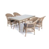 Обеденная группа «Амароне» относится к числу садовой мебели для обустройства открытых террас и веранд.В комплект входят:- обеденный стол «Латте» – 1600×900×750 мм- четыре стула «Сицилия», размер каждого – 590×640×820 мм.Алюминий используется при создании прочного каркаса мебели. Оформлен ручным плетением из круглого искусственного ротанга соломенного цвета.На креслах расположились мягкие подушки серого оттенка. Их чехлы изготовлены из полиэстера, плотность которого 230гр/м2. Ткань проходит обработку влагоотталкивающими составами.В качестве рабочей поверхности плетеного обеденного стола выступает стеклянная столешница, которая крепится при помощи вакуумных силиконовых держателей и поставляется в собранном виде.