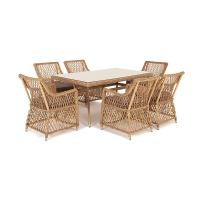 Обеденный комплект "Латте" в графитовом оттенке выполнен из искусственного ротанга и алюминиевого каркаса.Состоит из прямоугольного стола со стеклянной столешницей, размером 1600х900х750 мм и 6 кресел, размером - 680х550х840 мм.Кресла предполагают подушки со съемными влагоотталкивающими чехлами в комплекте.