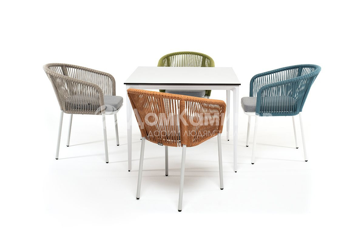 Комплект "Аркобалено" для обустройства обеденной зоны, рассчитан на 4 персоны.В комплект входят:- стол из HPL "Малага" 900х900х750 мм- стул "Марсель", роуп салатовый меланж - 570х620х775 мм- стул "Марсель", роуп бирюзовый - 570х620х775 мм- стул "Марсель", роуп оранжевый меланж - 570х620х775 мм- стул "Марсель", роуп серый меланж - 570х620х775 ммСтолешница стола "Малага" выполнена из современного высококачественного монолитного компакт-пластик HPL, толщиной 12 мм в молочном цветом. Материал устойчив к высоким температурам, попаданию влаги и может использоваться при любых погодных условиях. Подстолье изготовлено из крашеного алюминия белого цвета.Каркас стульев выполнен из алюминия. Оплетка выполнена вручную современным материалом - роупом. Цвет оплетки - бирюзовый, салатовый меланж, оранжевый меланж и серый меланж. В комплект входят подушки со съёмными водоотталкивающими чехлами светло-серого цвета.