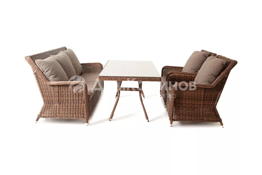Каркас мебели алюминиевый. Он оформлен с помощью искусственного ротанга круглой формы и был оплетен ручным способом. Цвет плетения - коричневый.