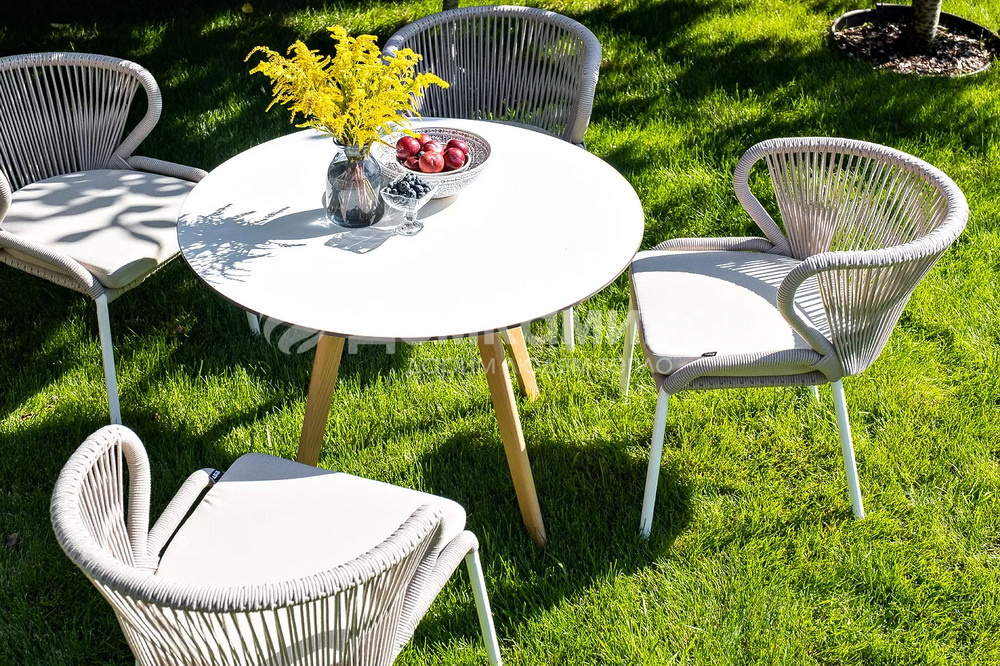 Обеденная дизайнерская группа "Фоджа" рассчитана на 4 персоны.В комплект входят:- 4 стула из коллекции "Милан" в бежевом цвете- стол со столешницей из компакт-пластика HPL молочного цвета, диаметр - 90 см. Подстолье выполнена из натурального дерева.Стулья изготовлены из алюминиевого каркаса, оплетенного вручную роупом - синтетическими лентами из полиэфирных волокон.В комплекте - подушки со съемными чехлами. Они обработаны влагоотталкивающей пропиткой, не пропускают случайно пролитую жидкость.