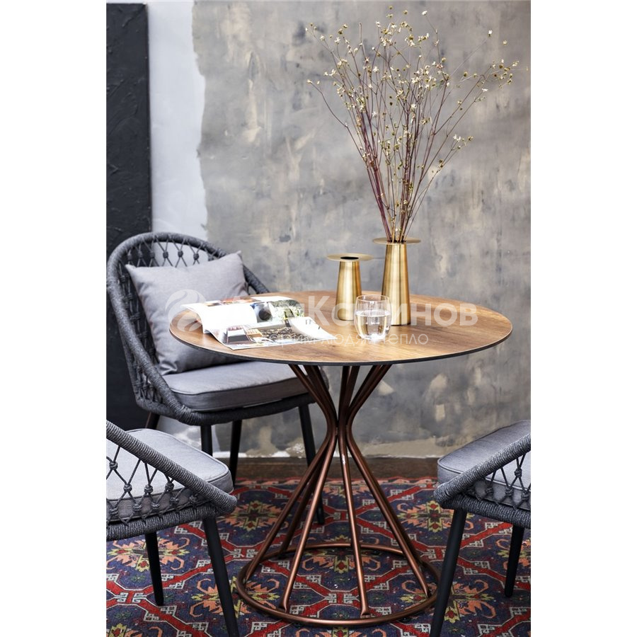Обеденная группа состоит из одного круглого стола со столешницей HPL цвета дуб, диаметр 90 см (металлическое подстолье) и трех кресел из алюминиевого каркаса, оплетенного вручную эластичными синтетическими лентами из высокопрочных полиэфирных волокон, в комплекте с подушкой, цвет темно-серый.