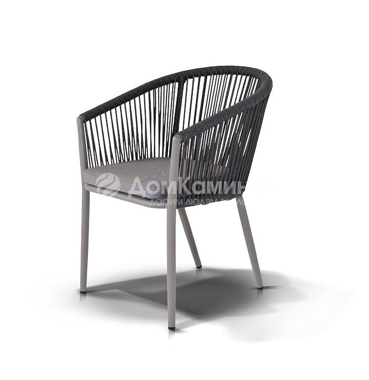 Обеденная группа состоит из стола со столешницей HPL цвета серый гранит, диаметр 90 см (стальное подстолье) и четырех кресел из алюминиевого каркаса, оплетенного вручную эластичными синтетическими лентами из высокопрочных полиэфирных волокон, в комплекте с подушкой, цвет темно-серый.