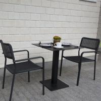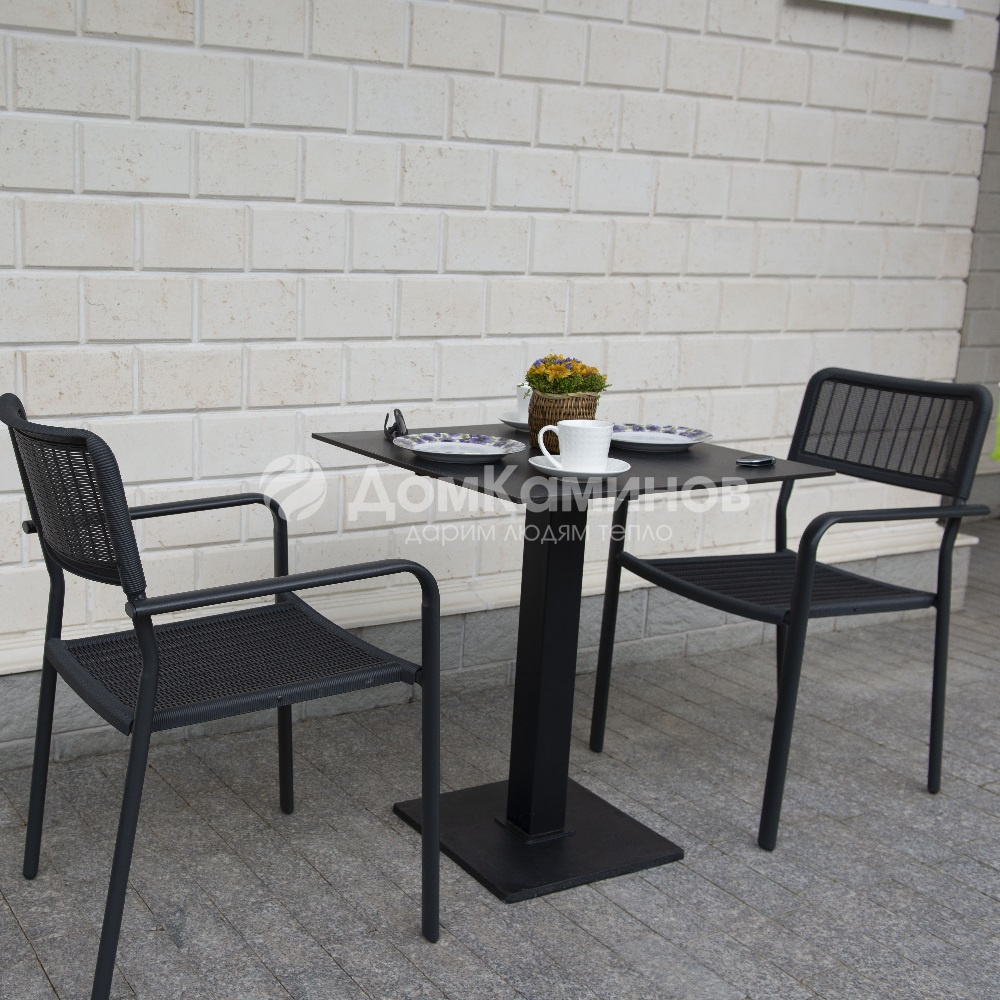 Обеденная группа состоит из стола со столешницей HPL цвета серый гранит, 65х65см (подстолье чугун) и двух стульев из алюминия с сидением и спинкой из высокопрочного пластика, цвет темно-серый.