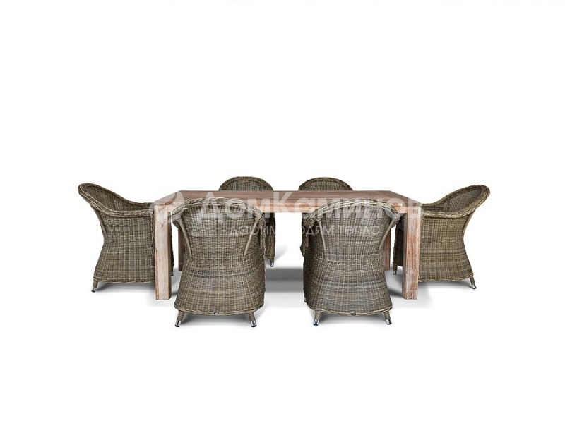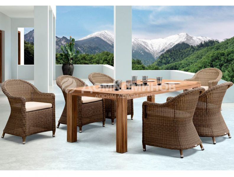 В лаунж зоне рационально поместить обеденную группу 4SIS Арбаро. В комплект входят 6 стульев и удобный стол. В изготовлении использованы высококачественные экологически безопасные материалы. Интересный дизайн стульев, выполненных на металлическом каркасе из искусственного ротанга, простота и удобство прочного устойчивого стола. Благородная цветовая гамма, комфорт и прочность исполнения.