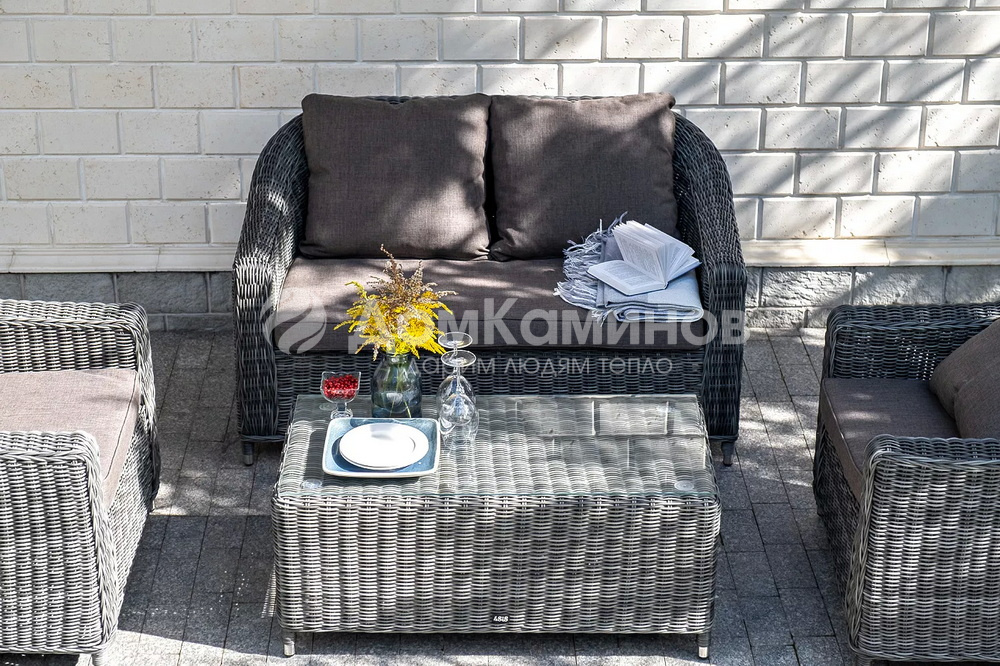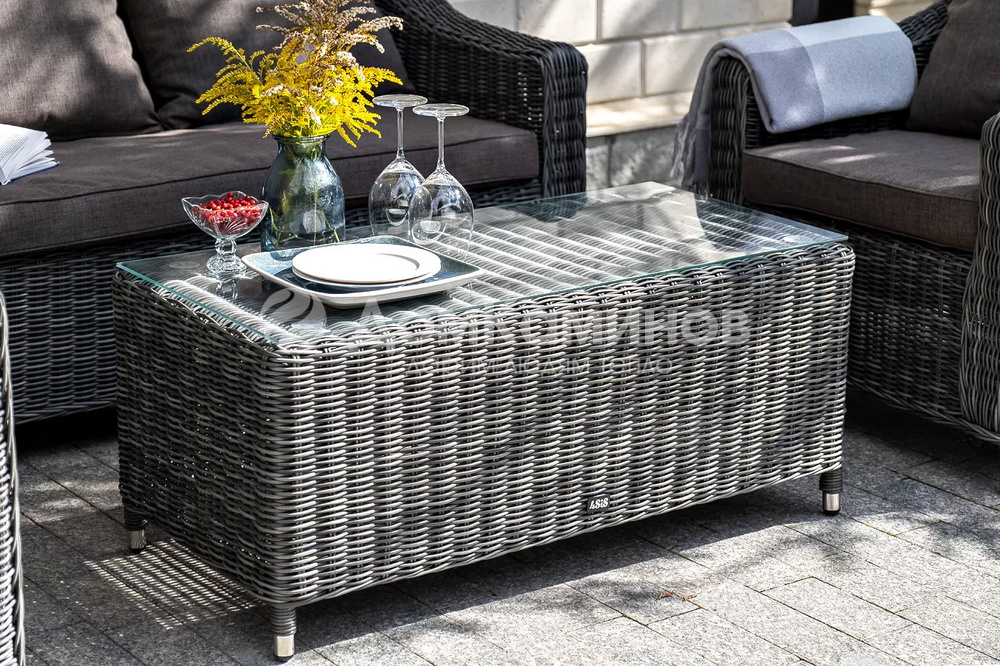 В основе мебели находится алюминиевый каркас высокой прочности. Декоративной составляющей является ручная круглая оплетка, которая выполнена из искусственного ротанга. Столик представлен в цвете "графит".