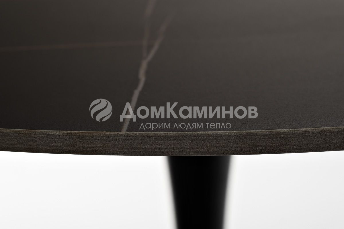 Черная столешница, сделанная из матовой керамики толщиной 12 мм, придает столу лаконичную элегантность. Металлическое основание и столб, покрытые черной порошковой краской, служат подстольем, обеспечивая устойчивость и долговечность изделия.